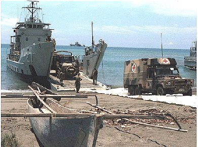 | Australian Military ambulance offloads at Suai on the Timor Sea |