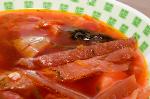 | Borscht Soup is a traditional Russian food made with beets, a variety of vegetables served with a generous dollop of sour cream |